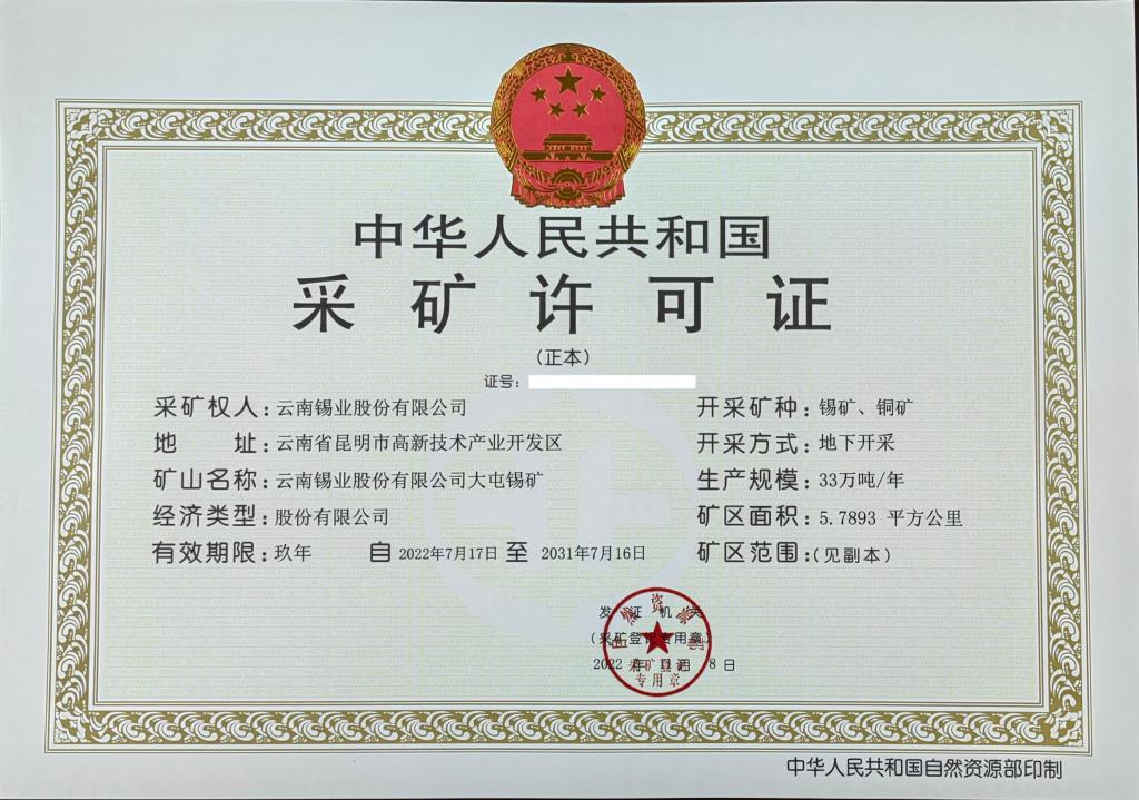 12月19日下午,大屯錫礦到北京取回采礦許可證,經(jīng)過一年多的艱辛付出和努力,大屯錫礦礦權(quán)辦理成功!