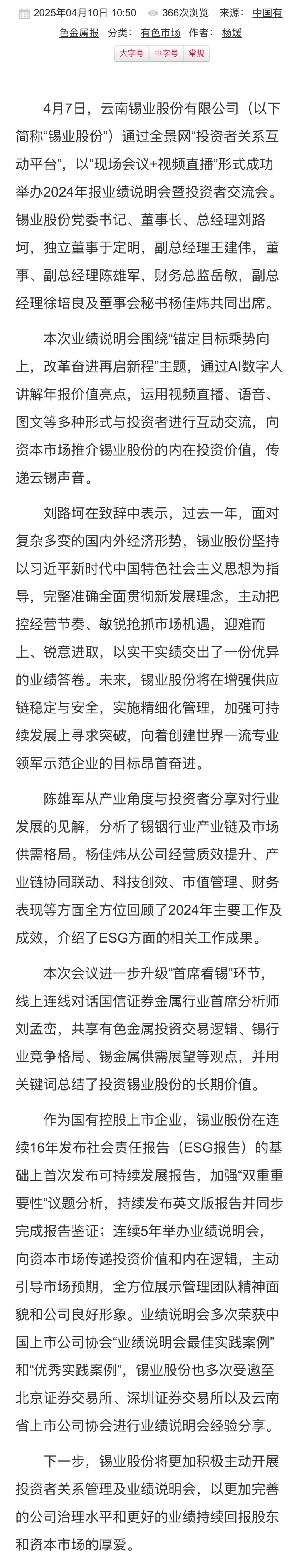 中國有色金屬報:錫業股份成功舉辦2024年報業績說明會