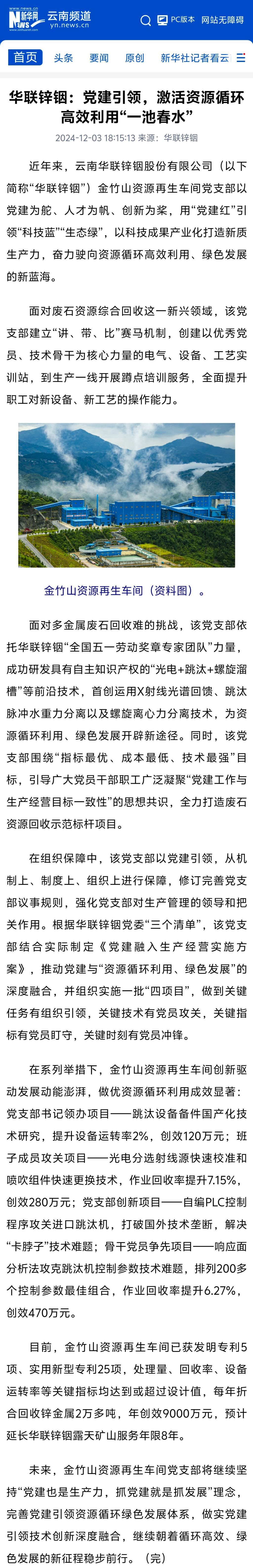 新華網:華聯鋅銦黨建引領,激活資源循環高效利用“一池春水”