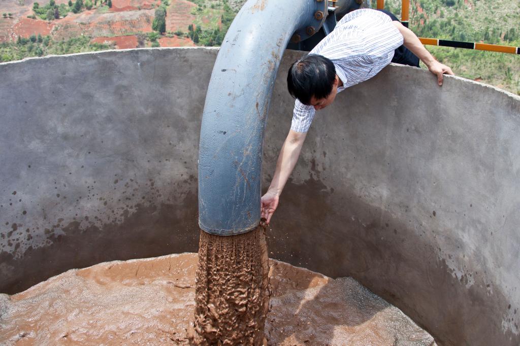 12時40分左右,17米多高的花墳二次濃縮塔緩沖池旁,站滿了施工及前來目睹第一管尾礦輸出的各路人馬,人們默默地屏住呼吸,神色凝重地盯著輸送管的出水口。13時整,輸送管存水由清漸濁,隨著幾聲“撲通、撲通”的聲響,尾礦泥漿以“濃濃”的情意、像帶著人們的重托和長久期盼,由輸送管道遠(yuǎn)遠(yuǎn)奔騰而來,暢快地一泄而出……